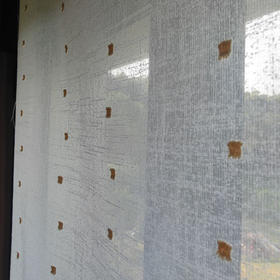 Este visillo tiene los elementos en color beige, los topos bordados son de pequeño tamaño, lo que se confiere un delicado aspecto, un diseño original y bonito que aporta calidez a cualquier ventana, ya sea en forma de cortinas o de estor tipo paqueto.